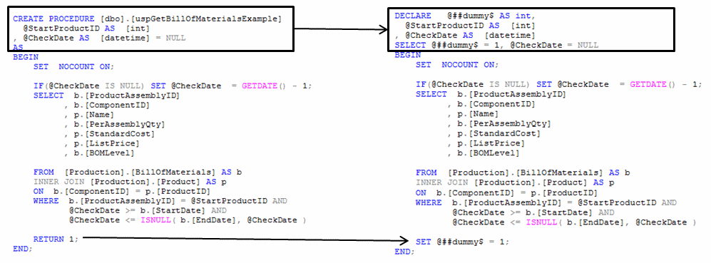 For example, the stored procedure statement on the left cannot generate execution plan XML, but after being rewritten by SQL Enlight, the resulting an expanded script (the one on the right) will be able to have an execution plan generated.